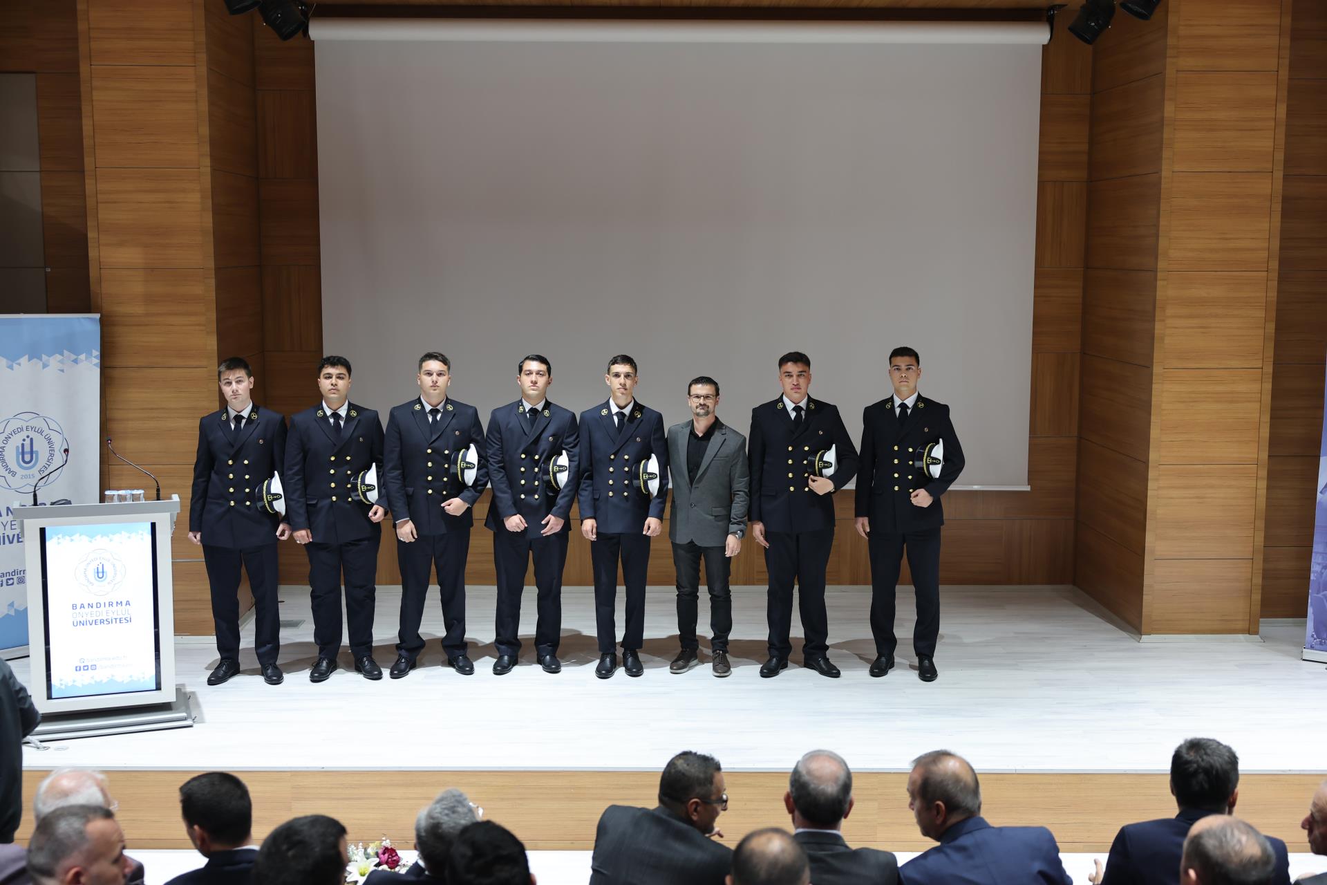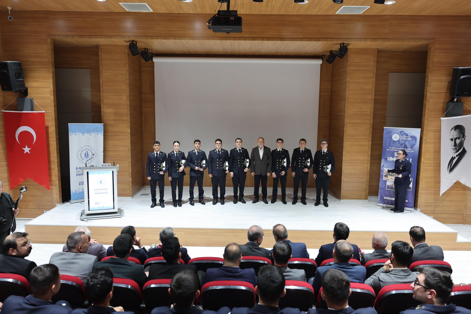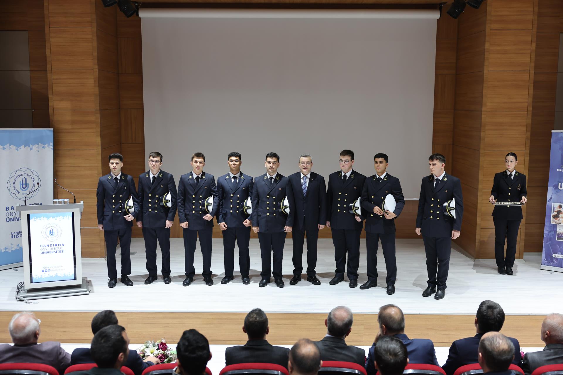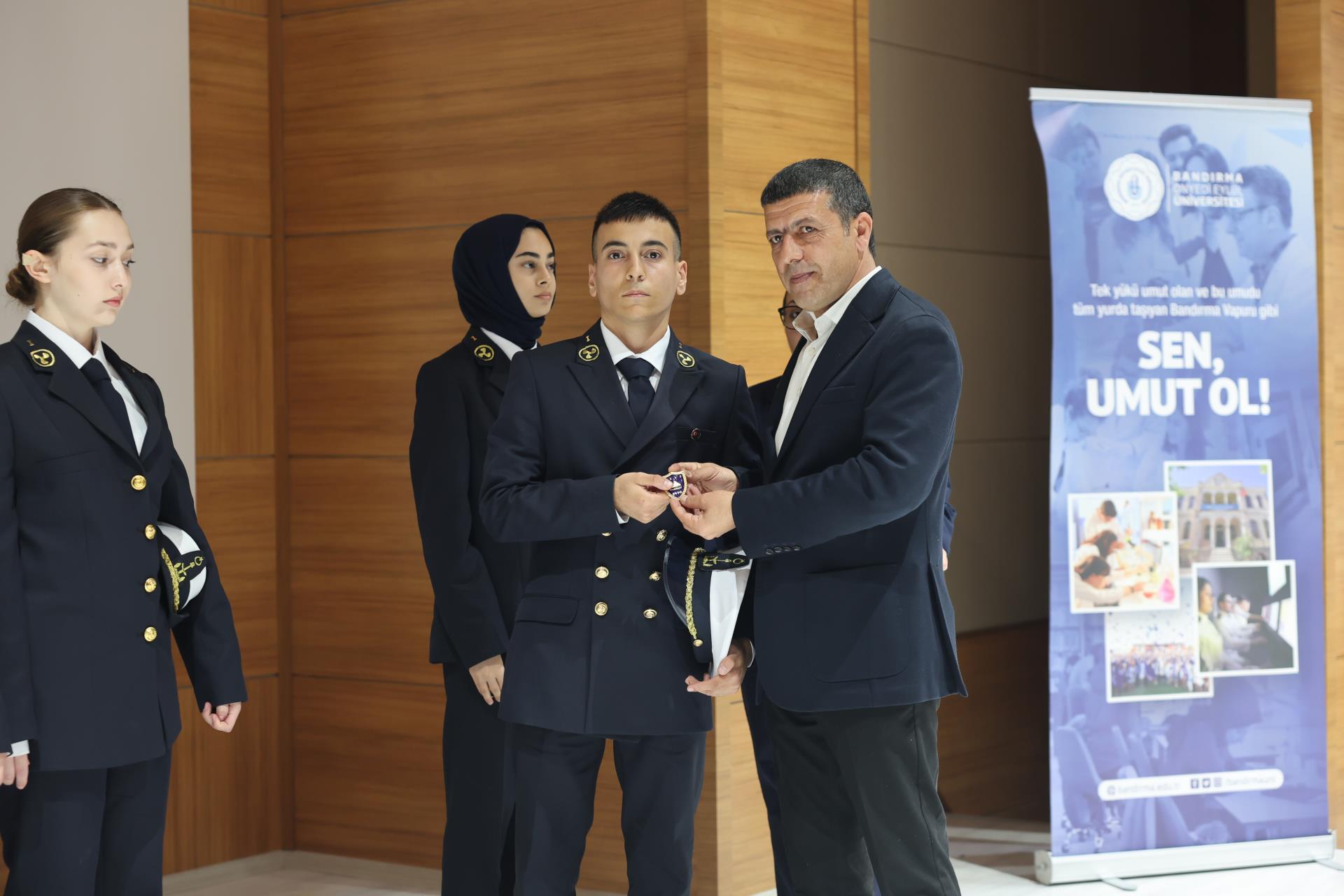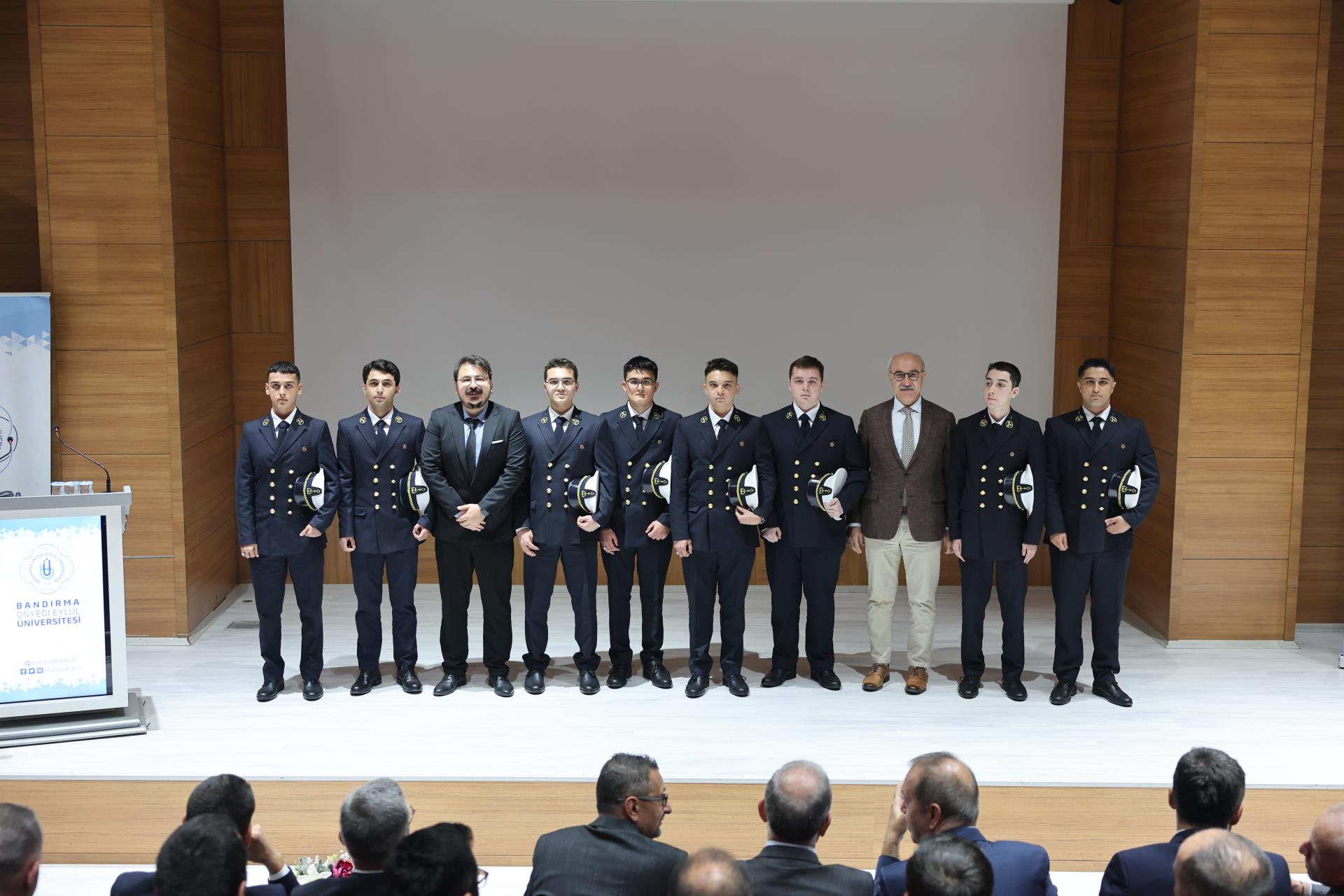 Bandırma Onyedi Eylül Üniversitesi Denizcilik Fakültesi, Deniz Ulaştırma İşletme Mühendisliği ve Gemi Makineleri İşletme Mühendisliği bölümlerinde öğrenim gören 1. sınıf öğrencilerinin “Üniforma Giyme ve Bröve Takma Töreni” büyük bir coşku ve gururla gerçekleştirildi. Denizcilik mesleğine ilk adımlarını atan öğrenciler, bu özel günde üniformalarını giyerek mesleki kimliklerinin sembolü olan brövelerini taktı.