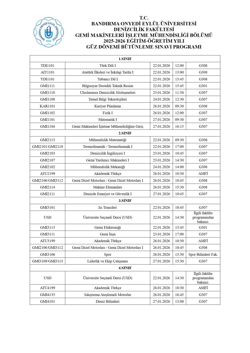 GMI3108 Makine Dairesi Simülatörü I Dersi bütünleme sınavı 24 Ocak 2026 Cumartesi günü saat 13:15'te Makine Dairesi Simülatörü Laboratuvarı'nda yapılacaktır.